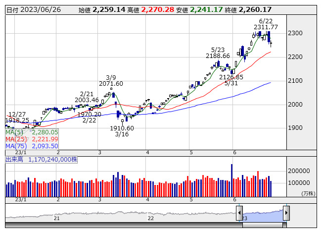 2023年06月27日08時46分 【市況】TOPIX先物:27日寄り付き=6.5ポイント安、2248.5ポイント TOPIX <日足> 「株探」多機能チャートより 27日8時45分、TOPIX先物期近2023年9月限は前日清算値比6.5ポイント安の2248.5ポイントで寄り付いた。前日のTOPIXの現物終値2260.17ポイントに対しては11.67ポイント安。夜間取引の終値2253ポイントに対しては4.5ポイント安となっている。 株探ニュース