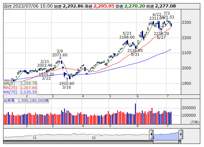 TOPIX <日足> 「株探」多機能チャートより日本取引所が公表した先物手口情報によると、7月6日のTOPIX先物期近(2023年9月限)の日中取引(立会内・J-NETの合算)で、買い越しトップはゴールドマン証券の3515枚、売り越しトップは三菱UFJ証券の3813枚だった。