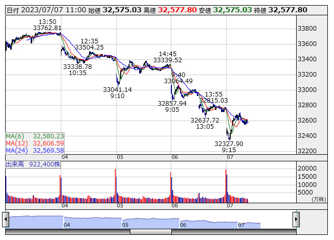 【市況】11時の日経平均は196円安の3万2576円、エーザイが24.57円押し下げ