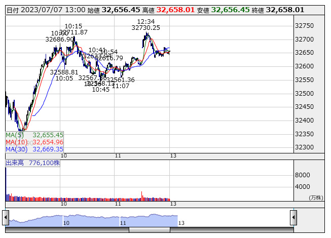 【市況】13時の日経平均は116円安の3万2656円、エーザイが20.54円押し下げ