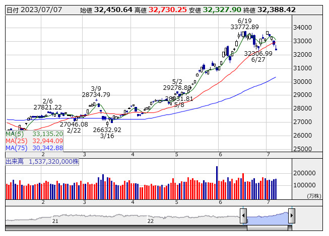 2023年07月08日08時46分 【市況】シカゴ日経平均先物 大取終値比 35円高 (7月7日) 日経平均 <日足> 「株探」多機能チャートよりシカゴ日経225先物9月限 (円建て) 32465 ( +35 ) シカゴ日経225先物9月限 (ドル建て) 32520 ( +90 ) ※( )は大阪取引所終値比 株探ニュース