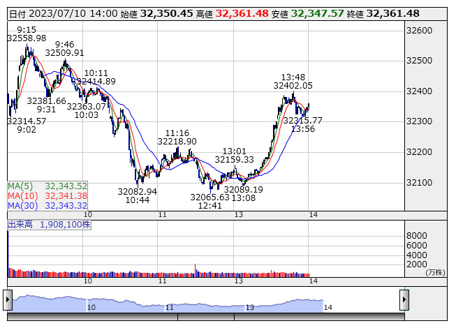 【市況】14時の日経平均は40円安の3万2347円、アドテストが29.82円押し下げ