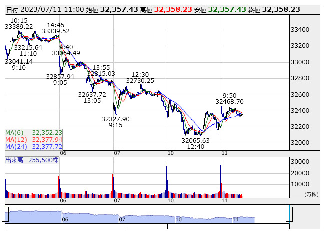 【市況】11時の日経平均は168円高の3万2358円、アドテストが55.24円押し上げ