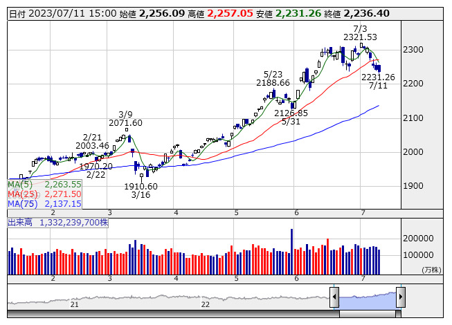 TOPIX <日足> 「株探」多機能チャートより2366.50ポイント ボリンジャーバンド3σ