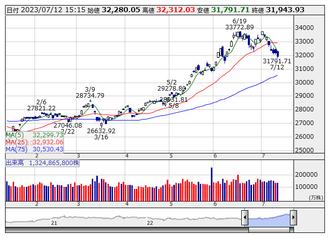 日経平均 <日足> 「株探」多機能チャートより日本取引所が公表した先物手口情報によると、7月12日の日経225ミニ期近(2023年7月限)の夜間取引(立会内・J-NETの合算)で、買い越しトップはBNPパリバ証券の1986枚、売り越しトップはABNクリアリン証券の1193枚だった。