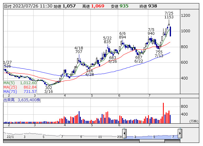 22. <4173> WACUL 東証G -5.5 880 人工知能関連