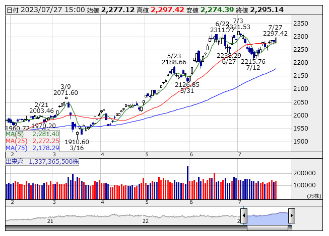 2023年07月27日15時17分 【市況】TOPIX先物:27日清算値=17ポイント高、2299ポイント TOPIX <日足> 「株探」多機能チャートより 27日15時15分、TOPIX先物期近2023年9月限は前日清算値比17ポイント高の2299ポイントで取引を終えた。出来高は4万9038枚だった。この日のTOPIXの現物終値2295.14ポイントに対しては3.86ポイント高。 株探ニュース