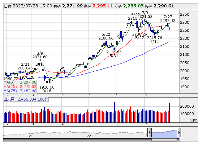 TOPIX <日足> 「株探」多機能チャートより2345.04ポイント ボリンジャーバンド3σ