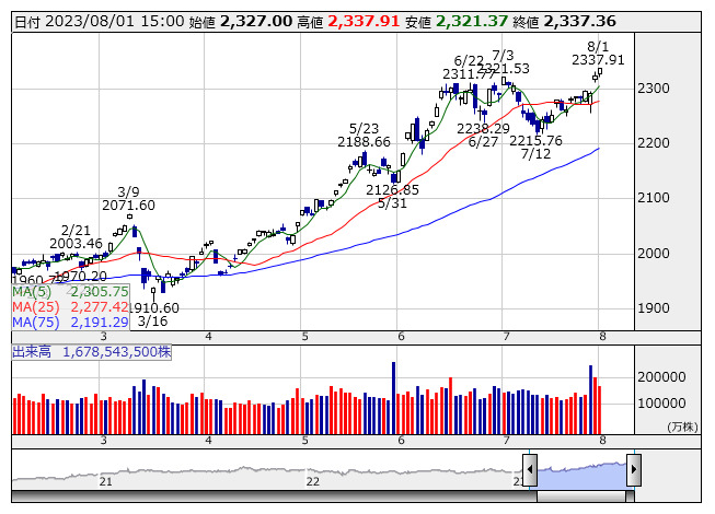 TOPIX <日足> 「株探」多機能チャートより2364.32ポイント ボリンジャーバンド3σ