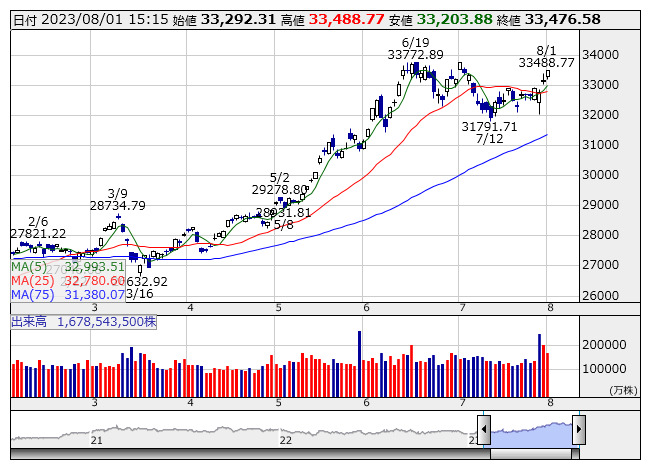 日経平均 <日足> 「株探」多機能チャートより外国為替市場では円安が進行している。足もとであれよという間に1ドル=142円台後半までドル買い・円売りの動きが加速した。これは株式市場にとって素直にプラス方向のベクトルとして作用しており、実際にこれから3月期決算企業の第1四半期発表が本格化するなか、収益見通しにも追い風材料となっている。前週末7月28日の日銀金融政策決定会合ではイールドカーブ・コントロール(YCC)の柔軟化という表現で、事実上のYCCの許容変動幅拡大を決めた。思い起こせば昨年12月、黒田日銀総裁時代に長期金利0.25%から0.5%程度への許容上限の引き上げを決めた時は銀行株が急騰し、日経平均は大幅下落するという絵に書いたようなインパクトをマーケットに与えた。その時の変動幅は差し引き0.25%の拡大を許容するものだったが、今回はそれよりも大きい。日銀は「目標はゼロ%程度で推移し変動幅は上下0.5%程度をメドとするが、指し値オペは1%で行う」という面妖な言いまわしで市場の顔色をうかがったが、端的に言えば何のことはない、長期金利は1.0%前後まで許容するということだ。