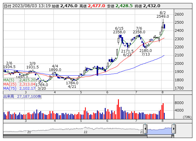 7203>は4日ぶり反落。同社は1日に発表した第1四半期(4~6月)決算内容が好感され翌2日には上場来高値を更新したが、きょうは高値警戒感も台頭するなか一服状態となっている。ただ、アナリストからは強気評価が出ており一段の上昇期待も膨らんでいる。岩井コスモ証券は2日、同社株の投資判断「A」を継続するとともに目標株価を2600円から2850円に引き上げた。第1四半期の連結営業利益は前年同期比93.7%増の1兆1209億円だった。半導体不足の改善や円安効果により1兆円超えを達成した。会社側は24年3月期の同利益は3兆円(前期比10.1%増)で据え置いたが、同証券では業績の進捗や足もとの生産状況などを踏まえれば計画を上回る業績達成確度は高まった、と指摘し3兆6000億円への増額修正を予想。25年3月期の同利益は3兆9000億円と一段の増益を見込んでいる。