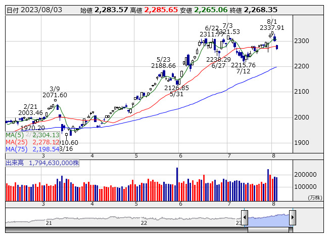 2023年08月04日08時46分 【市況】TOPIX先物:4日寄り付き=12ポイント安、2255ポイント TOPIX <日足> 「株探」多機能チャートより 4日8時45分、TOPIX先物期近2023年9月限は前日清算値比12ポイント安の2255ポイントで寄り付いた。前日のTOPIXの現物終値2268.35ポイントに対しては13.35ポイント安。夜間取引の終値2254.5ポイントに対しては0.5ポイント高となっている。 株探ニュース