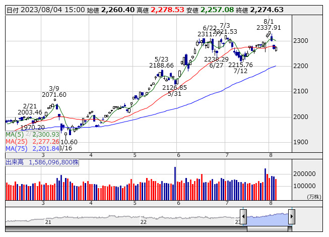 2023年08月04日15時17分 【市況】TOPIX先物:4日清算値=4ポイント高、2271ポイント TOPIX <日足> 「株探」多機能チャートより 4日15時15分、TOPIX先物期近2023年9月限は前日清算値比4ポイント高の2271ポイントで取引を終えた。出来高は6万4664枚だった。この日のTOPIXの現物終値2274.63ポイントに対しては3.63ポイント安。 株探ニュース