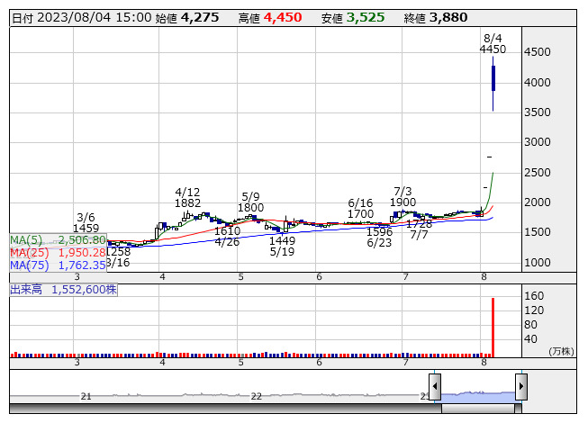 内海造 <日足> 「株探」多機能チャートより(1)好材料出現で連日急騰を演じた銘柄