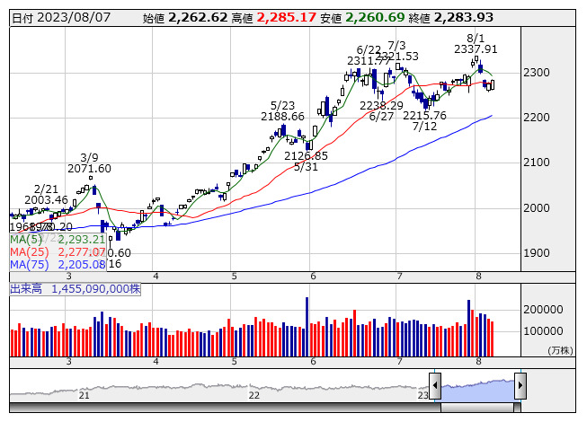 2023年08月08日08時46分 【市況】TOPIX先物:8日寄り付き=5ポイント高、2293ポイント TOPIX <日足> 「株探」多機能チャートより 8日8時45分、TOPIX先物期近2023年9月限は前日清算値比5ポイント高の2293ポイントで寄り付いた。前日のTOPIXの現物終値2283.93ポイントに対しては9.07ポイント高。夜間取引の終値2295ポイントに対しては2ポイント安となっている。 株探ニュース