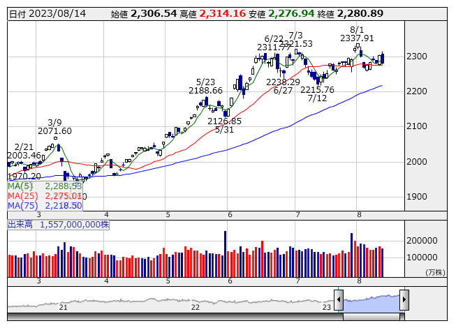 TOPIX <日足> 「株探」多機能チャートより2358.98ポイント ボリンジャーバンド3σ