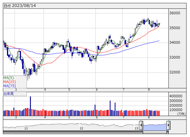 NYダウ <日足> 「株探」多機能チャートより15日の日本株市場は、買い優勢の相場展開になりそうだ。14日の米国市場はNYダウが26ドル高、ナスダックは143ポイント高だった。中国の住宅市場を巡る混乱が世界経済の成長リスクになるとの投資家の不安が浮上したほか、米長期金利の上昇も相場の重荷となった。しかし、今週予定されている主要小売り企業の決算発表を控え、下値も限定的。また、エヌビディアが7%を超える上昇となるなど、半導体株に買い戻しの動きが強まったことから、上昇に転じた。シカゴ日経225先物清算値は、大阪比205円高の32295円。円相場は1ドル145円50銭台で推移している。