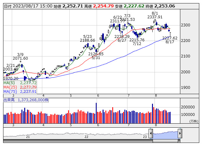 2023年08月17日15時17分 【市況】TOPIX先物:17日清算値=2ポイント安、2255ポイント TOPIX <日足> 「株探」多機能チャートより 17日15時15分、TOPIX先物期近2023年9月限は前日清算値比2ポイント安の2255ポイントで取引を終えた。出来高は5万7039枚だった。この日のTOPIXの現物終値2253.06ポイントに対しては1.94ポイント高。 株探ニュース