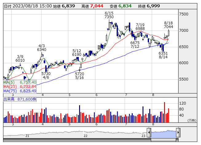 <6361> 荏原 6999 +159 ( +2.3%) 6757.4 6732.8
