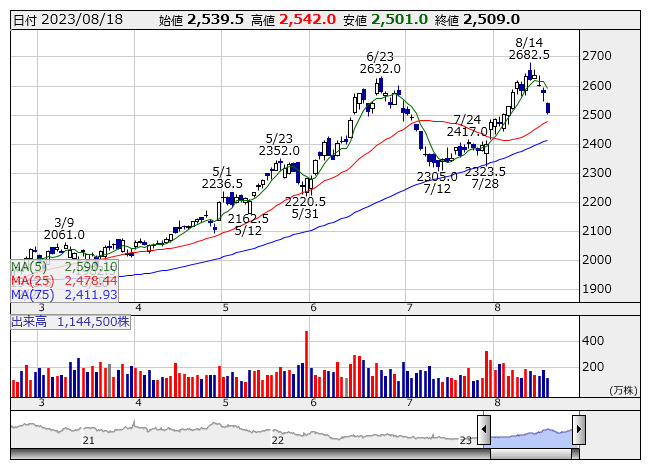 日本取引所 <日足> 「株探」多機能チャートより(東証プライム上場 1834 銘柄対象)