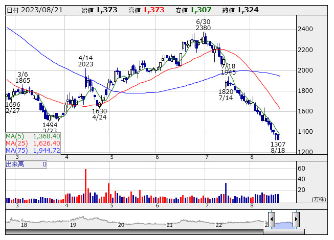 ウォンテッド <日足> 「株探」多機能チャートより21日寄り付き ストップ高: 2銘柄 ストップ安: 2銘柄 (気配、一時を含む)