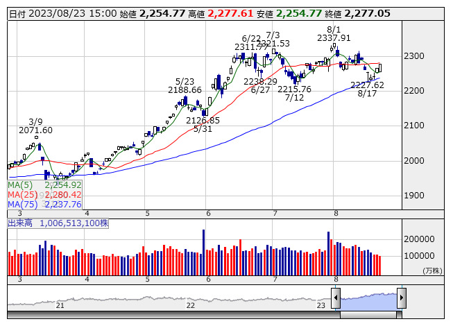 2277.05ポイント 23日TOPIX現物終値