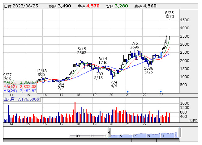 物語コーポ <月足> 「株探」多機能チャートより今週の日経平均株価は、米ハイテク株高と円安追い風となり、前週末比173円高の3万1624円と反発した。相場全体が上昇するなか、上値追いで上場来高値を更新した銘柄は31社だった。上場来高値を更新した銘柄は過去の売買による抵抗帯がなく、いわゆる“株価青天井”銘柄として注目される。