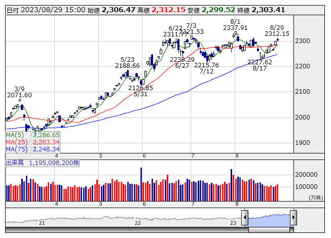 TOPIX <日足> 「株探」多機能チャートより2351.02ポイント ボリンジャーバンド3σ