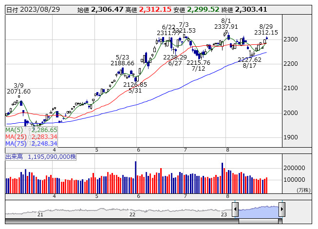 2023年08月30日08時46分 【市況】TOPIX先物:30日寄り付き=11.5ポイント高、2316ポイント TOPIX <日足> 「株探」多機能チャートより 30日8時45分、TOPIX先物期近2023年9月限は前日清算値比11.5ポイント高の2316ポイントで寄り付いた。前日のTOPIXの現物終値2303.41ポイントに対しては12.59ポイント高。夜間取引の終値2316ポイントに対しては変わらずとなっている。 株探ニュース