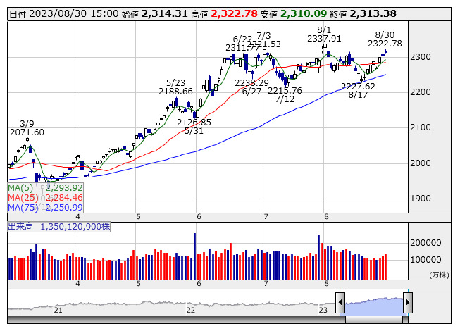 2313.38ポイント 30日TOPIX現物終値