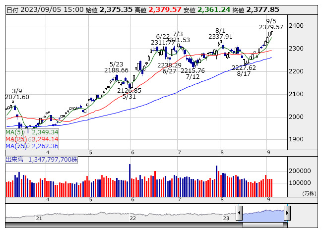 2023年09月05日15時17分 【市況】TOPIX先物:5日清算値=2ポイント安、2375ポイント TOPIX <日足> 「株探」多機能チャートより 5日15時15分、TOPIX先物期近2023年9月限は前日清算値比2ポイント安の2375ポイントで取引を終えた。出来高は4万8312枚だった。この日のTOPIXの現物終値2377.85ポイントに対しては2.85ポイント安。 株探ニュース