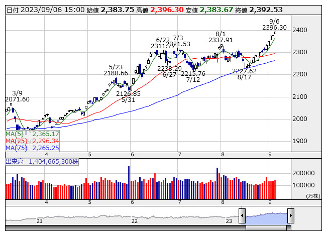 TOPIX <日足> 「株探」多機能チャートより2416.84ポイント ボリンジャーバンド3σ