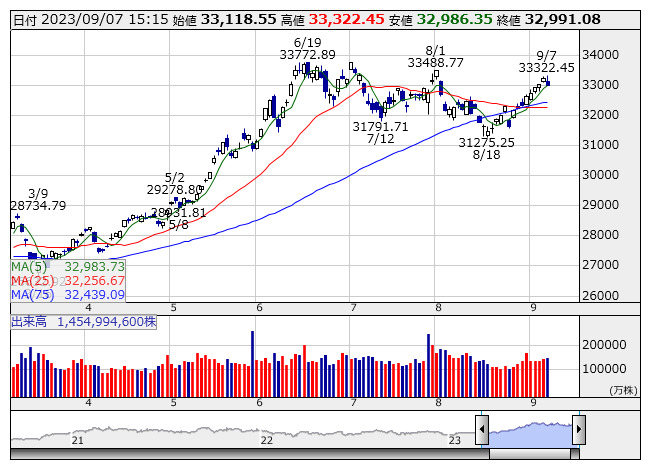 2023年09月07日16時31分 【市況】日経225先物:7日夜間取引寄り付き=30円安、3万2740円 日経平均 <日足> 「株探」多機能チャートより 7日16時30分、大阪取引所の日経225先物期近2023年12月限は日中取引の清算値比30円安の3万2740円で寄り付いた。日経平均株価の現物終値3万2991.08円に対しては251.08円安。 株探ニュース