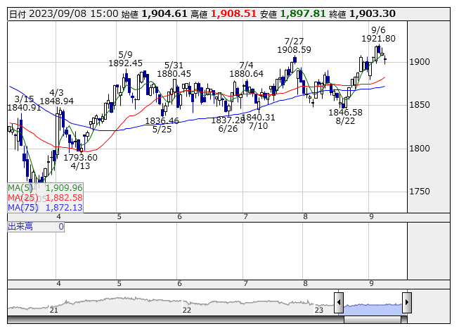2023年09月08日15時17分 【市況】東証REIT指数先物:8日清算値=5.5ポイント安、1893ポイント REIT指数 <日足> 「株探」多機能チャートより 8日15時15分、東証REIT指数先物期近2023年12月限は前日清算値比5.5ポイント安の1893ポイントで取引を終えた。出来高は1301枚だった。この日の東証REIT指数の現物終値1903.3ポイントに対しては10.3ポイント安。 株探ニュース