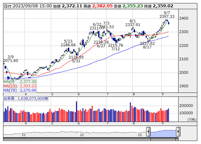 TOPIX <日足> 「株探」多機能チャートより2434.57ポイント ボリンジャーバンド3σ