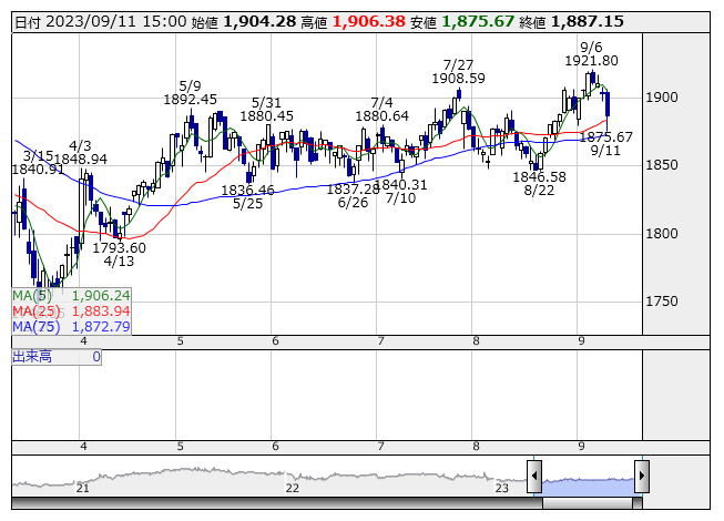 2023年09月11日15時17分 【市況】東証REIT指数先物:11日清算値=23ポイント安、1870ポイント REIT指数 <日足> 「株探」多機能チャートより 11日15時15分、東証REIT指数先物期近2023年12月限は前週末清算値比23ポイント安の1870ポイントで取引を終えた。出来高は266枚だった。この日の東証REIT指数の現物終値1887.15ポイントに対しては17.15ポイント安。 株探ニュース