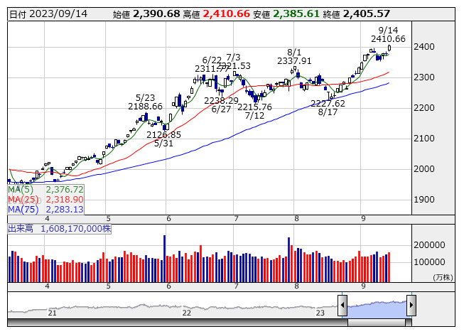 2023年09月15日08時46分 【市況】TOPIX先物:15日寄り付き=21ポイント高、2406ポイント TOPIX <日足> 「株探」多機能チャートより 15日8時45分、TOPIX先物期近2023年12月限は前日清算値比21ポイント高の2406ポイントで寄り付いた。前日のTOPIXの現物終値2405.57ポイントに対しては0.43ポイント高。夜間取引の終値2403.5ポイントに対しては2.5ポイント高となっている。 株探ニュース