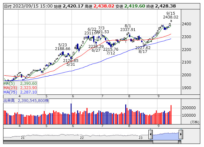2023年09月15日15時17分 【市況】TOPIX先物:15日清算値=20.5ポイント高、2405.5ポイント TOPIX <日足> 「株探」多機能チャートより 15日15時15分、TOPIX先物期近2023年12月限は前日清算値比20.5ポイント高の2405.5ポイントで取引を終えた。出来高は7万854枚だった。この日のTOPIXの現物終値2428.38ポイントに対しては22.88ポイント安。 株探ニュース