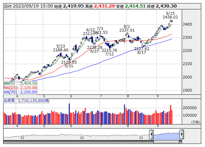 TOPIX <日足> 「株探」多機能チャートより日本取引所が公表した先物手口情報によると、9月19日のTOPIX先物期近(2023年12月限)の日中取引(立会内・J-NETの合算)で、買い越しトップはバークレイズ証券の2899枚、売り越しトップはゴールドマン証券の2945枚だった。