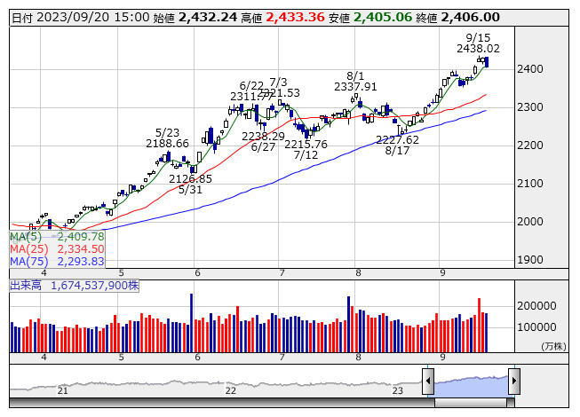 2023年09月20日15時17分 【市況】TOPIX先物:20日清算値=23.5ポイント安、2389ポイント TOPIX <日足> 「株探」多機能チャートより 20日15時15分、TOPIX先物期近2023年12月限は前日清算値比23.5ポイント安の2389ポイントで取引を終えた。出来高は6万7807枚だった。この日のTOPIXの現物終値2406ポイントに対しては17ポイント安。 株探ニュース