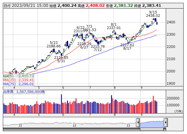 2363.00ポイント 21日先物清算値