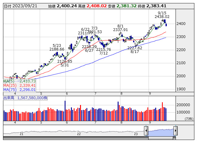 TOPIX <日足> 「株探」多機能チャートより2488.52ポイント ボリンジャーバンド3σ