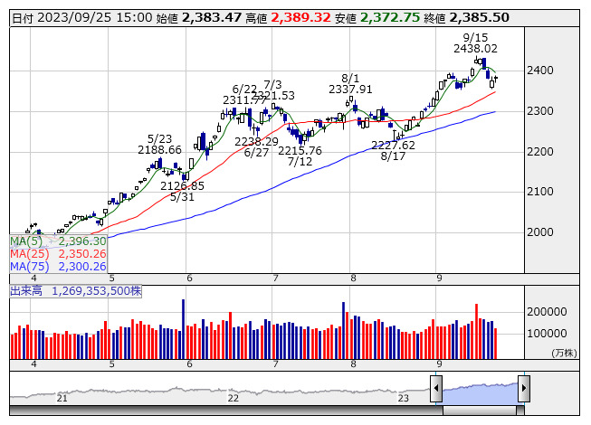 2023年09月25日15時17分 【市況】TOPIX先物:25日清算値=6ポイント高、2364.5ポイント TOPIX <日足> 「株探」多機能チャートより 25日15時15分、TOPIX先物期近2023年12月限は前週末清算値比6ポイント高の2364.5ポイントで取引を終えた。出来高は5万2658枚だった。この日のTOPIXの現物終値2385.5ポイントに対しては21ポイント安。 株探ニュース