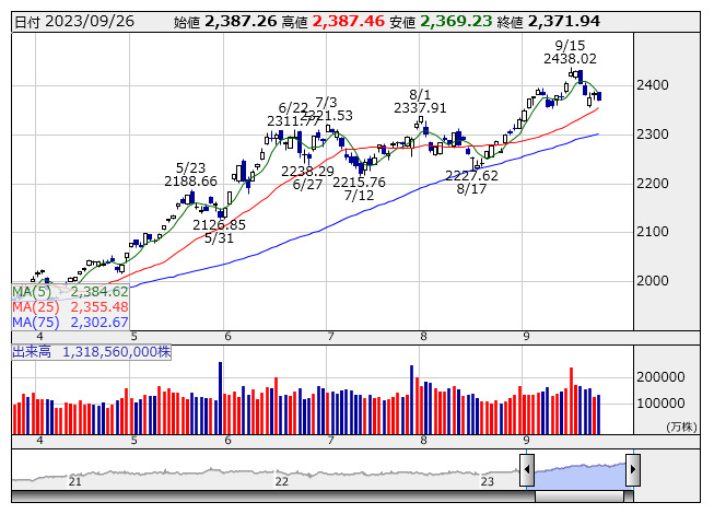 2023年09月27日08時46分 【市況】TOPIX先物:27日寄り付き=13.5ポイント安、2337.5ポイント TOPIX <日足> 「株探」多機能チャートより 27日8時45分、TOPIX先物期近2023年12月限は前日清算値比13.5ポイント安の2337.5ポイントで寄り付いた。前日のTOPIXの現物終値2371.94ポイントに対しては34.44ポイント安。夜間取引の終値2339ポイントに対しては1.5ポイント安となっている。 株探ニュース