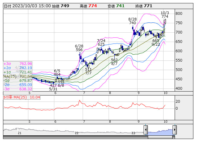 YEデジタル <日足> ボリンジャー/カイリ率 「株探」多機能チャートより●株価が+3σを上回った銘柄(市場人気順) ★株価の上げ足が速過ぎ、売りが出やすい銘柄