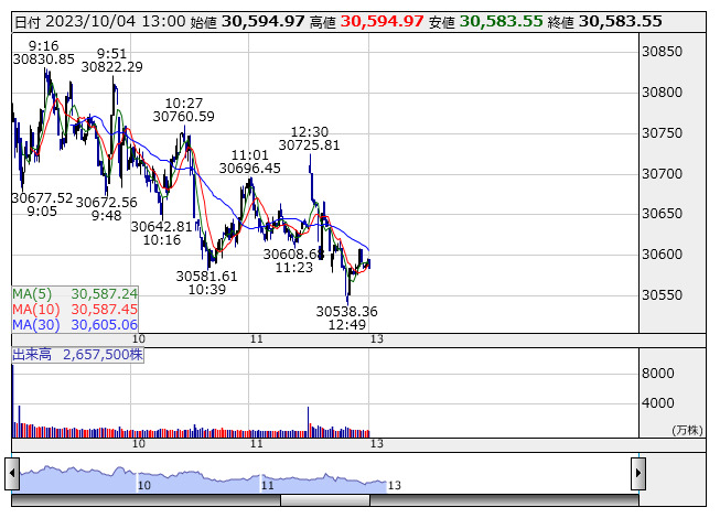 【市況】13時の日経平均は646円安の3万591円、アドテストが62.34円押し下げ