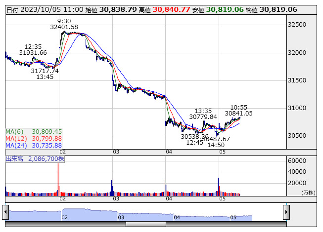【市況】11時の日経平均は313円高の3万840円、アドテストが41.83円押し上げ