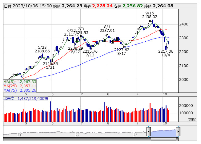 2023年10月06日15時17分 【市況】TOPIX先物:6日清算値=3.5ポイント高、2263ポイント TOPIX <日足> 「株探」多機能チャートより 6日15時15分、TOPIX先物期近2023年12月限は前日清算値比3.5ポイント高の2263ポイントで取引を終えた。出来高は6万3558枚だった。この日のTOPIXの現物終値2264.08ポイントに対しては1.08ポイント安。 株探ニュース