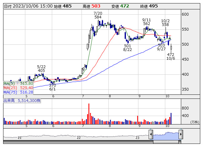オンワード <日足> 「株探」多機能チャートより■オンワード <8016> 495円 (-27円、-5.2%)