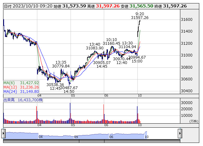 2023年10月10日09時23分 【市況】日経平均の上げ幅が600円突破 日経平均 <5分足> 「株探」多機能チャートより 日経平均株価の上げ幅が600円を突破。9時22分現在、602.59円高の3万1597.26円まで上昇している。 株探ニュース